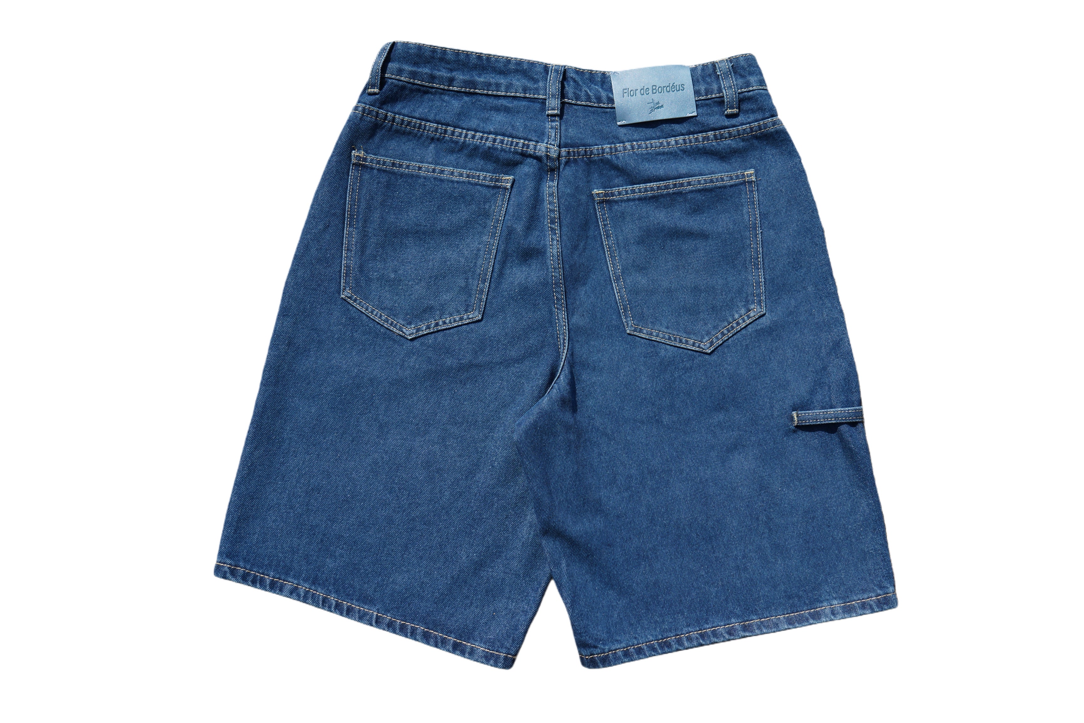 Un bleu inspiré des filets de pêche à Esmoriz, rincés par le sel et le temps.Un short au ton profond, comme l’Atlantique qu’on porte sur soi.Derrière, un patch en cuir bleu ciel, la touche Flor de Bordéus.